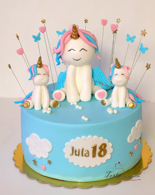 Niebieski tort z 3 jednorożcami.