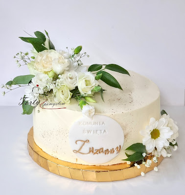 Tort komunijny z żywymi kwiatami.